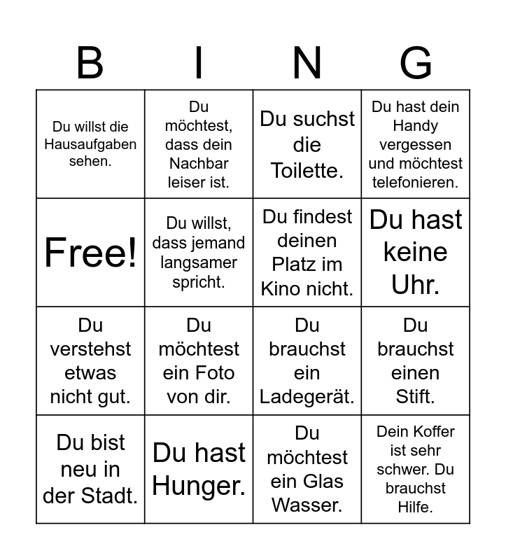 This bingo card has 16 words: Du hast Hunger., Du brauchst einen Stift., Du suchst die Toilette., Du willst die Hausaufgaben sehen., Du verstehst etwas nicht gut., Du möchtest, dass dein Nachbar leiser ist., Du brauchst ein Ladegerät., Du möchtest ein Glas Wasser., Free!, Du willst, dass jemand langsamer spricht., Du bist neu in der Stadt., Du hast dein Handy vergessen und möchtest telefonieren., Du möchtest ein Foto von dir., Du hast keine Uhr., Du findest deinen Platz im Kino nicht. and Dein Koffer ist sehr schwer. Du brauchst Hilfe..
