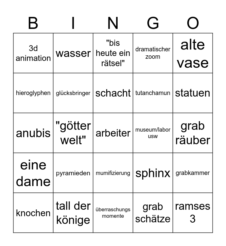 This bingo card has a free space and 24 words: pyramieden, tall der könige, schacht, knochen, alte vase, 3d animation, hieroglyphen, wasser, museum/labor usw, mumifizierung, tutanchamun, anubis, sphinx, grabkammer, glücksbringer, grab schätze, grab räuber, "bis heute ein rätsel", statuen, "götter welt", ramses 3, eine dame, dramatischer zoom and überraschungs momente.