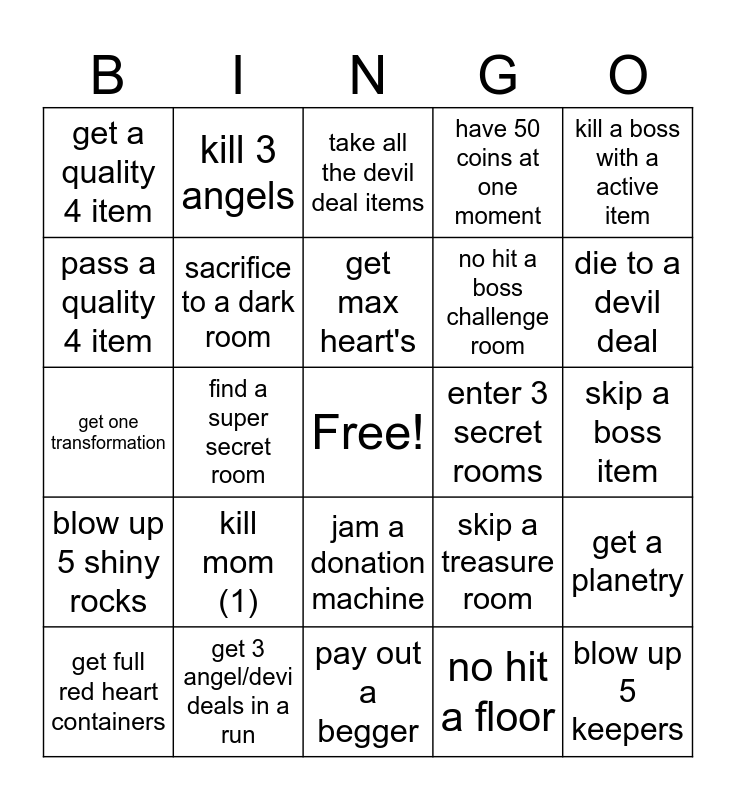 This bingo card has a free space and 24 words: kill mom (1), get 3 angel/devi deals in a run, get max heart's, get full red heart containers, kill a boss with a active item, get a quality 4 item, pass a quality 4 item, kill 3 angels, enter 3 secret rooms, jam a donation machine, no hit a boss challenge room, get one transformation, skip a treasure room, get a planetry, sacrifice to a dark room, no hit a floor, skip a boss item, take all the devil deal items, die to a devil deal, find a super secret room, blow up 5 keepers, blow up 5 shiny rocks, have 50 coins at one moment and pay out a begger.