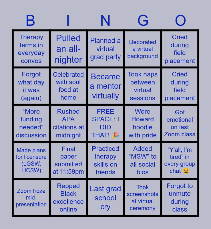 This bingo card has a free space and 101 words: “You’ll be an amazing social worker”, Cap & gown selfie, Cried during field placement, Decorated a virtual background, Final paper submitted at 11:59pm, Inspirational Black scholar speech, Received a job offer, Pulled an all-nighter, Planned a virtual grad party, Subscribed to alumni emails, Group project flashbacks, Practiced therapy skills on friends, Sat through a Zoom marathon, Surprise guest speaker, Took screenshots at virtual ceremony, Last grad school cry, Made plans for licensure (LGSW, LICSW), Zoom froze mid-presentation, Celebrated with takeout or home-cooked meal, “Remember your why” reminder, Final goodbye hugs over FaceTime, Valedictorian screen-share moment, Forgot to unmute during class, “You’ll be an amazing social worker”, Cap & gown selfie, Cried during field placement, Decorated a virtual background, Final paper submitted at 11:59pm, Inspirational Black scholar speech, Received a job offer, Pulled an all-nighter, Planned a virtual grad party, FREE SPACE: I DID THAT!, Subscribed to alumni emails, Group project flashbacks, Practiced therapy skills on friends, Sat through a Zoom marathon, Surprise guest speaker, Took screenshots at virtual ceremony, Last grad school cry, Made plans for licensure (LGSW, LICSW), Zoom froze mid-presentation, Celebrated with takeout or home-cooked meal, “Remember your why” reminder, Final goodbye hugs over FaceTime, Forgot to unmute during class, Impatient classmate in breakout room, Loud background noise on Zoom, Final grades posted in Canvas, DM’d classmates during lectures, Surprised by an honors email, Forgot what day it was (again), Overwhelmed by “What’s next?”, Rewrote your LinkedIn bio, Signed off your last class, “Don’t forget to rest” reminder, Social work memes got me through, Prayed before a virtual exam, Imposter syndrome, who?, Classmate turned bestie via chat, Celebrated with soul food at home, “That’s not ethical!” in breakout, Glitched out in the middle of class, Daydreamed about policy change, Snacked during field Zoom calls, Took naps between virtual sessions, Called out systemic injustice, Rushed APA citations at midnight, Repped Black excellence online, Professor said “great insight” in comments, That one class shook me, Advocated for someone in need, Therapy terms in everyday convos, Found a mentor through email, Became a mentor virtually, “More funding needed” discussion, Called a ‘social justice warrior’, Quoted bell hooks in an assignment, Skipped a class for self-care, Cried from gratitude, Downloaded every syllabus, Made a vision board, Wore Howard hoodie with pride, Realized I AM the change, Played music after turning in final, “Closed 30 tabs” after finals, Got emotional on last Zoom class, Forgot to hit “Submit” before the deadline, Danced around after turning in last assignment, Binge-watched a show after finals, Added “MSW” to all social bios, Woke up and forgot graduation already happened, Emailed a professor at midnight 📧, Turned in an assignment seconds before the deadline ⏱️, Got inspired during a guest lecture ✨, “Y’all, I’m tired” in every group chat 😩, Created a Canva presentation last minute 🎨, Journaled to stay grounded 📝, Bragged about Howard in discussion boards 💙, Forgot to eat while writing a paper 🍽️ and Thanked God after the last final 🙏🏽.