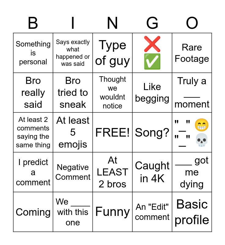 This bingo card has a free space and 24 words: Negative Comment, We ____ with this one, Thought we wouldnt notice, Coming, Rare Footage, Something is personal, Bro really said, Says exactly what happened or was said, Song?, At LEAST 2 bros, Like begging, At least 2 comments saying the same thing, Caught in 4K, ___ got me dying, Bro tried to sneak, An "Edit" comment, "_" 😁 "_" 💀, Type of guy, Truly a ___ moment, At least 5 emojis, Basic profile, I predict a comment, ❌ ✅ and Funny.
