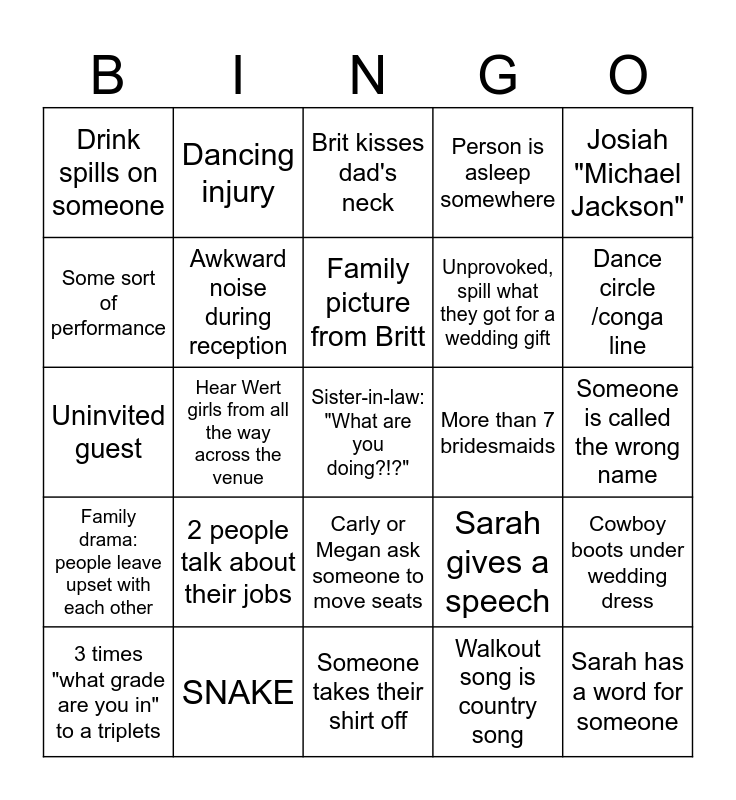 This bingo card has 30 words: SNAKE, Breydan drinks alchol, Hear Wert girls from all the way across the venue, Awkward speech, Drink spills on someone, Brit kisses dad's neck, Awkward noise during reception, Carly or Megan ask someone to move seats, More than 7 bridesmaids, Someone takes their shirt off, Someone is called the wrong name, Sister-in-law: "What are you doing?!?", Walkout song is country song, Sarah has a word for someone, Dance circle /conga line, Married woman dances with someone else's husband, Sarah gives a speech, Family drama: people leave upset with each other, 2 people talk about their jobs, Josiah "Michael Jackson", Uninvited guest, "scooting" or "clasping hands" reference, Dancing injury, Unprovoked, spill what they got for a wedding gift, Some sort of performance, Person is asleep somewhere, Cowboy boots under wedding dress, 3 times "what grade are you in" to a triplets, Family picture from Britt and Jason cries.