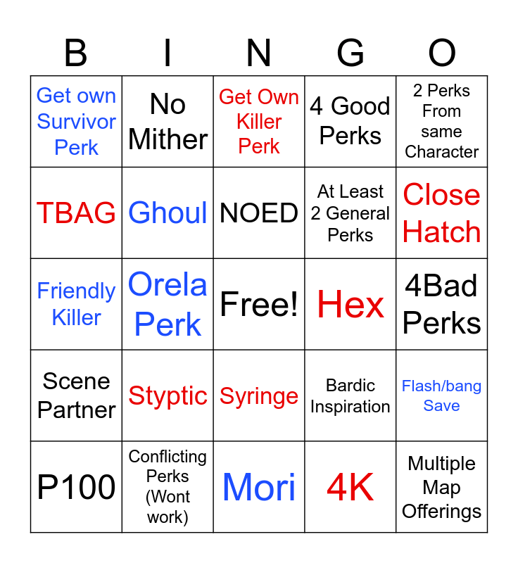 This bingo card has a free space and 54 words: Haste/Hinder Perk, Scene Partner, Same perk three times, Boon, Syringe, Corrupt Inteverntion, 4 Good Perks, Same perk as Teammate, TBAG, Gen Rush, Get own Survivor Perk, Survivor give up, Conflicting Perks (Wont work), P100, DC, Mori, Multiple Map Offerings, At Least 2 General Perks, Scourge Hook, 4Bad Perks, Bardic Inspiration, Decisive Strike, Hex, 2 Perks From same Character, Gen Regression Perk, No Mither, Double Exhaustion, Invocation, Indoor Map, 4K, Escape, Tunneled, Slug, Brand New Part, Get Own Killer Perk, Gen Perk, Friendly Killer, Flash/bang Save, sus Name, Ghoul, Killer <2% pick rate, Witcher Skin, Hatch Escape, Toxic Endgame, Styptic, Pinhead Perk, Wholesome Endgame, Escape With New Item, NOED, Orela Perk, Close Hatch, TTV, Perk <1% Pick Rate and Perk <1% Pick Rate.