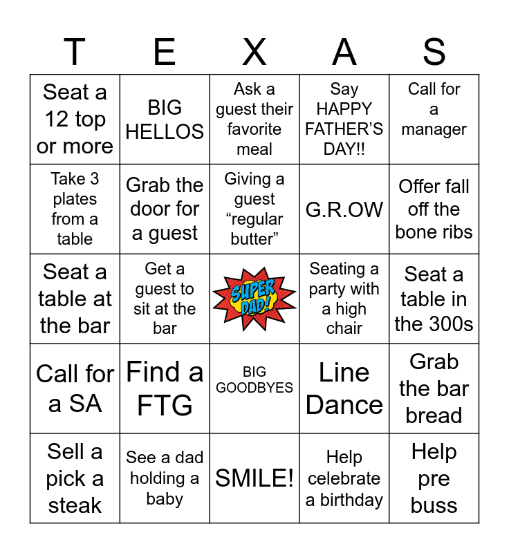 This bingo card has a free space and 24 words: Find a FTG, See a dad holding a baby, Giving a guest “regular butter”, Sell a pick a steak, Call for a manager, Seat a 12 top or more, Take 3 plates from a table, BIG HELLOS, Seating a party with a high chair, BIG GOODBYES, G.R.OW, Seat a table at the bar, Line Dance, Grab the bar bread, Grab the door for a guest, Help celebrate a birthday, Seat a table in the 300s, Ask a guest their favorite meal, Offer fall off the bone ribs, Get a guest to sit at the bar, Help pre buss, Call for a SA, Say HAPPY FATHER’S DAY!! and SMILE!.
