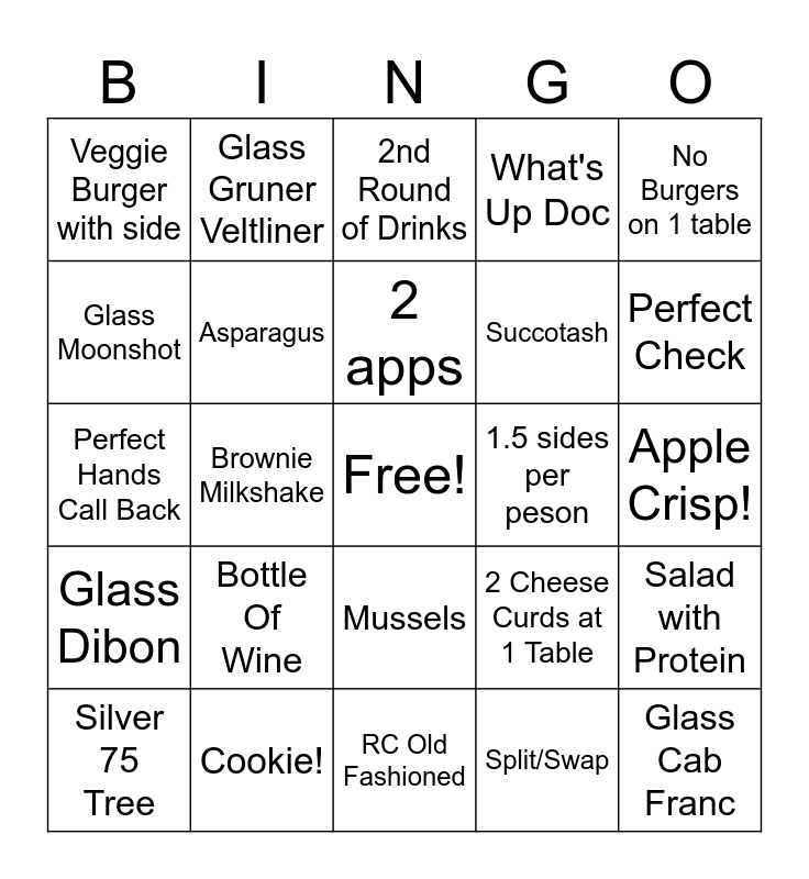 This bingo card has a free space and 24 words: Bottle Of Wine, Cookie!, 2 apps, Silver 75 Tree, No Burgers on 1 table, Veggie Burger with side, Glass Moonshot, Glass Gruner Veltliner, 1.5 sides per peson, Mussels, Succotash, Perfect Hands Call Back, 2 Cheese Curds at 1 Table, Salad with Protein, Asparagus, Split/Swap, Apple Crisp!, 2nd Round of Drinks, Perfect Check, Brownie Milkshake, Glass Cab Franc, Glass Dibon, What's Up Doc and RC Old Fashioned.