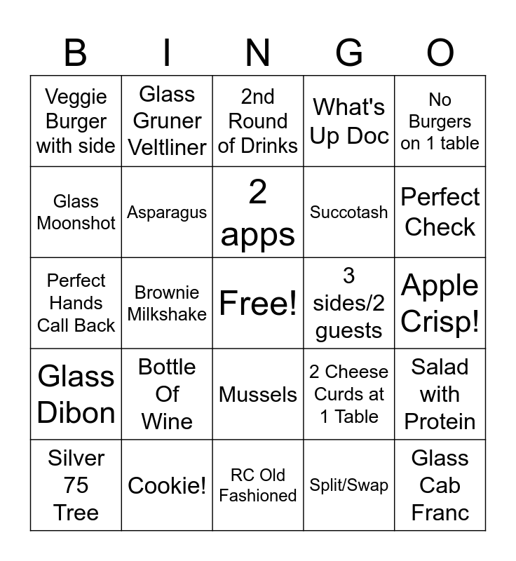 This bingo card has a free space and 24 words: Bottle Of Wine, Cookie!, 2 apps, Silver 75 Tree, No Burgers on 1 table, Veggie Burger with side, Glass Moonshot, Glass Gruner Veltliner, 3 sides/2 guests, Mussels, Succotash, Perfect Hands Call Back, 2 Cheese Curds at 1 Table, Salad with Protein, Asparagus, Split/Swap, Apple Crisp!, 2nd Round of Drinks, Perfect Check, Brownie Milkshake, Glass Cab Franc, Glass Dibon, What's Up Doc and RC Old Fashioned.