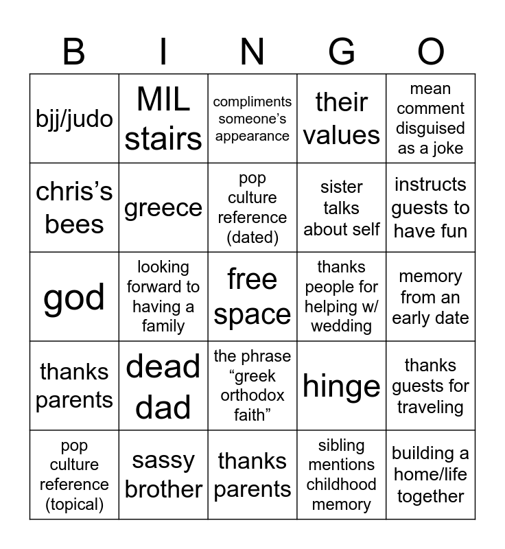 This bingo card has a free space and 24 words: dead dad, sassy brother, pop culture reference (dated), pop culture reference (topical), mean comment disguised as a joke, bjj/judo, chris’s bees, MIL stairs, thanks people for helping w/ wedding, the phrase “greek orthodox faith”, sister talks about self, god, hinge, thanks guests for traveling, greece, sibling mentions childhood memory, memory from an early date, compliments someone’s appearance, instructs guests to have fun, looking forward to having a family, building a home/life together, thanks parents, their values and thanks parents.