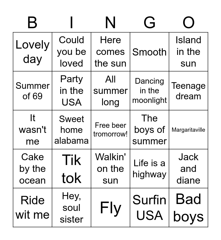 This bingo card has a free space and 38 words: Maria maria, Brown eyed girl, Dreams, Party in the USA, Jack and diane, Tik tok, All summer long, Firework, Island in the sun, Dancing in the moonlight, Sweet home alabama, Smooth, Bad boys, Margaritaville, Summer of 69, Cake by the ocean, Soak up the sun, Here comes the sun, Summer breeze, The boys of summer, Lovely day, Hey, soul sister, Teenage dream, Ride wit me, I wanna dance with somebody, Fly, Pocketful of sunshine, Steal my sunshine, Return of the mack, Riptide, California dreamin', Walkin' on the sun, Surfin USA, Could you be loved, Blurred lines, Life is a highway, It wasn't me and Hot in herre.