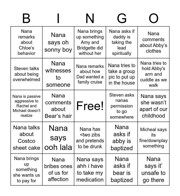This bingo card has a free space and 24 words: Nana says ooh lala, Nana bribes ones of us for affection, Nana remarks about how Dad wanted a family cruise, Nana brings up something she wants us to pay for, Nana comments about Abby’s clothes, Nana remarks about Chloe’s behavior, Steven talks about being overwhelmed, Nana says oh sonny boy, Steven asks nanas permission to go somewhere, Nana has <two zibs and pretends to be drunk, Nana tries to take a group pic to put up in the house, Nana is passive aggressive to Rachel and Michael doesn’t realize, Nana asks if abby is baptized, Micheal says its fine/downplay something, Nana witnesses to someone, Nana asks if bear is baptized, Nana says she wasn’t apart of our childhood, Nana brings up something Amy and Bridgette did without her, Nana tries to hold Abby's arm and cuddle as we walk, Nana comments about Bear’s hair, Nana says it’ unsafe to go there, Nana talks about Costco sheet cake, Nana asks if daddy is taking the lead spiritually and Nana says ahh i have to take my medication.
