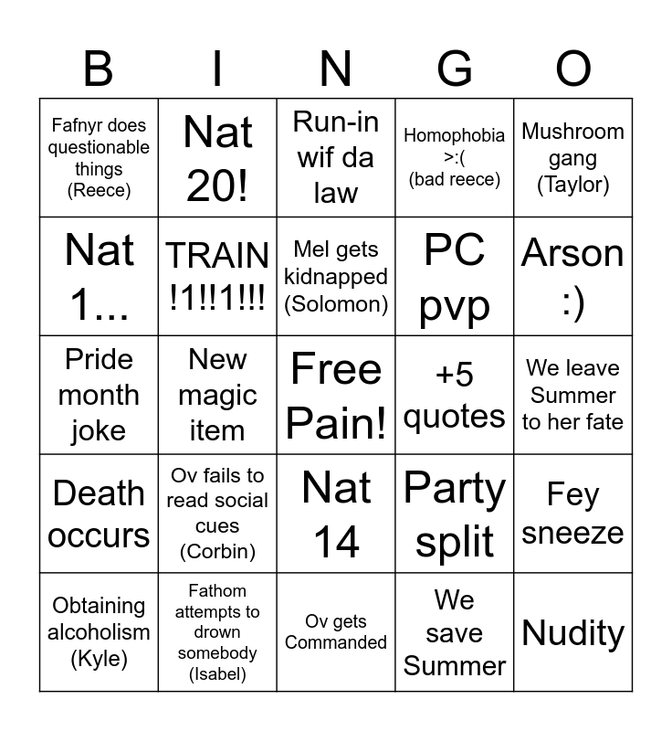 This bingo card has a free space and 24 words: Ov fails to read social cues (Corbin), Fathom attempts to drown somebody (Isabel), Mel gets kidnapped (Solomon), Obtaining alcoholism (Kyle), Mushroom gang (Taylor), Fafnyr does questionable things (Reece), Nat 1..., Nat 20!, +5 quotes, Nat 14, PC pvp, Pride month joke, Party split, Fey sneeze, TRAIN !1!!1!!!, We save Summer, We leave Summer to her fate, Run-in wif da law, Arson :), New magic item, Nudity, Death occurs, Homophobia >:( (bad reece) and Ov gets Commanded.