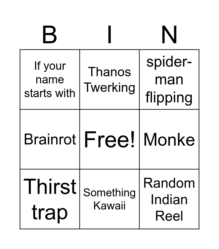 This bingo card has a free space and 8 words: Monke, spider-man flipping, Thanos Twerking, Thirst trap, If your name starts with, Random Indian Reel, Brainrot and Something Kawaii.