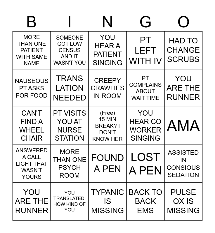 This bingo card has a free space and 34 words: LAB CALLS: BLOOD CLOTTED, BACK TO BACK EMS, RAN OUT OF WARM BLANKETS, HELPED IN A LOBBY ASSIST, ANSWERED A CALL LIGHT THAT WASN'T YOURS, TRANS LATION NEEDED, HAD TO CHANGE SCRUBS, YOU ARE THE RUNNER, SOMEONE GOT LOW CENSUS AND IT WASN'T YOU, *BON QUIQUI VOICE* sehCURitee, CREEPY CRAWLIES IN ROOM, YOU HEAR A PATIENT SINGING, "I ALREADY PEED", HAD TO CHANGE SCRUBS, YOU HEAR CO WORKER SINGING, YOU ARE THE RUNNER, YOU TRANSLATED, HOW KIND OF YOU, CAN'T FIND A WHEEL CHAIR, MORE THAN ONE PSYCH ROOM, LOST A PEN, FOUND A PEN, TRANS PORT DELAY, MORE THAN ONE PATIENT WITH SAME NAME, AMA, TYPANIC IS MISSING, PULSE OX IS MISSING, PT LEFT WITH IV, YOU STEPPED IN SOMEHTING GROSS, PT COMPLAINS ABOUT WAIT TIME, NAUSEOUS PT ASKS FOR FOOD, YOU GOT PEED ON, PT VISITS YOU AT NURSE STATION, ASSISTED IN CONSIOUS SEDATION and ACCUCHECK WAS NOT QC'D BOO!.