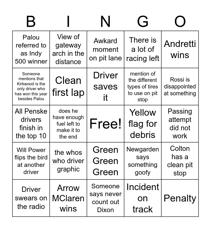 This bingo card has a free space and 24 words: the whos who driver graphic, Arrow MClaren wins, Driver saves it, Driver swears on the radio, Andretti wins, Palou referred to as Indy 500 winner, Someone mentions that Kirkwood is the only driver who has won this year besides Palou, View of gateway arch in the distance, Yellow flag for debris, Green Green Green, mention of the different types of tires to use on pit stop, All Penske drivers finish in the top 10, Newgarden says something goofy, Colton has a clean pit stop, Clean first lap, Incident on track, Passing attempt did not work, Awkard moment on pit lane, Rossi is disappointed at something, does he have enough fuel left to make it to the end, Penalty, Will Power flips the bird at another driver, There is a lot of racing left and Someone says never count out Dixon.