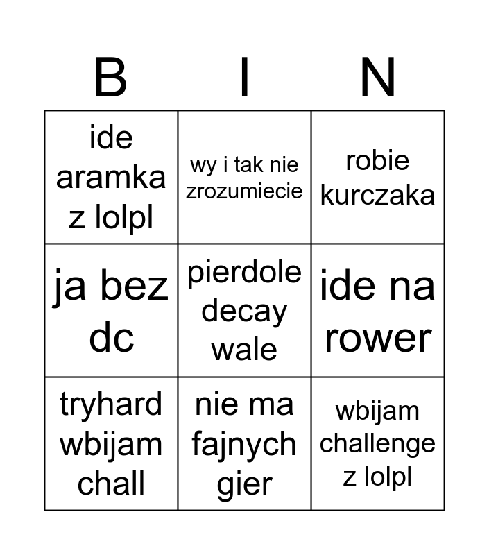 This bingo card has a free space and 8 words: ide na rower, robie kurczaka, wy i tak nie zrozumiecie, tryhard wbijam chall, ide aramka z lolpl, wbijam challenge z lolpl, ja bez dc and nie ma fajnych gier.