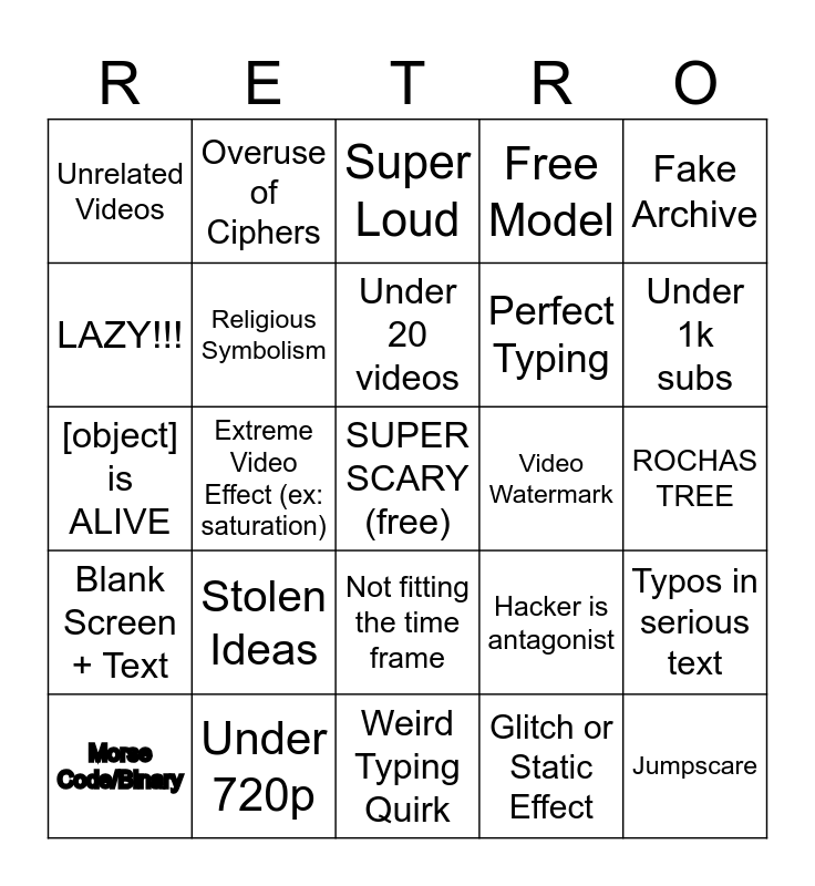 This bingo card has a free space and 29 words: Morse Code/Binary, Parasite, Extreme Video Effect (ex: saturation), Actually Good, Unrelated Videos, Super Loud, Religious Symbolism, Stolen Ideas, Video Watermark, Under 720p, ROCHAS TREE, Jumpscare, Weird Typing Quirk, Glitch or Static Effect, Under 1k subs, No vids over 5 mins, Not fitting the time frame, Blank Screen + Text, Fake Archive, [object] is ALIVE, Hacker is antagonist, Objectively Not Scary, Perfect Typing, LAZY!!!, Free Model, Overuse of Ciphers, Typos in serious text, Under 20 videos and Symbolism for Depression.