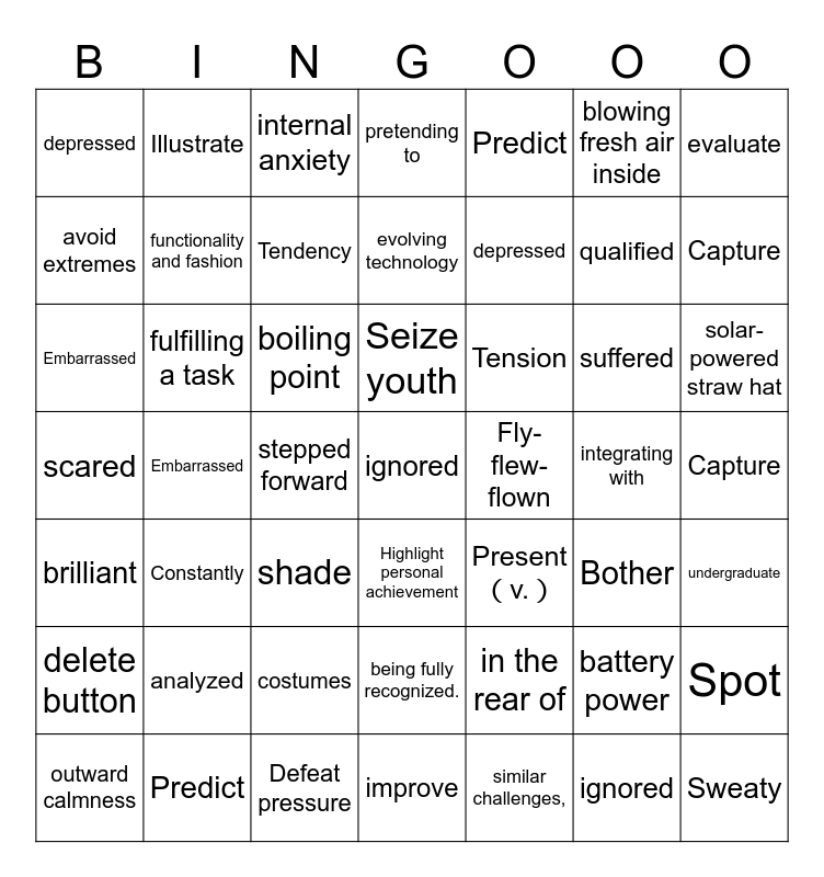 This bingo card has 102 words: Photography, Spot, Predict, Capture, fascinating rewards, Capture, shooting time, avoid extremes, delete button, overexposed, landscape, overly stress achievement., similar challenges,, suggest otherwise., Reflect, undergraduate, fulfilling a task, Encounter, Overburdened., Determined., mental disorder, academic pressure., outward calmness, inside stress., being fully recognized., Tendency, pretending to, boiling point, attach importance to efforts, reveal, Illustrate, internal anxiety, a relaxing lifestyle., Defeat pressure, Highlight personal achievement, Seize youth, pursue dreams, sweaty, evolving technology, stepped forward, Sweaty, brilliant, solar-powered straw hat, in the rear of, Constantly, shade, most sized heads, functionality and fashion, Possesses, battery power, Stylish, integrating with, blowing fresh air inside, block wind blowing, Be suitable for., Be unique to., Be typical of., Be particular about., Feedback, qualified, costumes, assess, enthusiasts, Tension, Bother, Present(v.), cooperate with, Embarrassed, depressed, scared, suffered, analyzed, ignored, Described, cycled, Fly-flew-flown, evaluate, improve, Photography, Spot, Predict, Capture, fascinating rewards, Capture, shooting time, avoid extremes, delete button, overexposed, landscape, assess, enthusiasts, Tension, Bother, Present(v.), cooperate with, Embarrassed, depressed, scared, suffered, analyzed, ignored and Described.