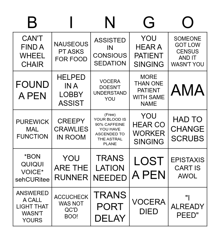 This bingo card has a free space and 39 words: LAB CALLS: BLOOD CLOTTED, BACK TO BACK EMS, RAN OUT OF WARM BLANKETS, HELPED IN A LOBBY ASSIST, ANSWERED A CALL LIGHT THAT WASN'T YOURS, TRANS LATION NEEDED, VOCERA DOESN'T UNDERSTAND YOU, PT CALLS 911 FROM ER, SOMEONE GOT LOW CENSUS AND IT WASN'T YOU, *BON QUIQUI VOICE* sehCURitee, CREEPY CRAWLIES IN ROOM, YOU HEAR A PATIENT SINGING, "I ALREADY PEED", HAD TO CHANGE SCRUBS, YOU HEAR CO WORKER SINGING, YOU ARE THE RUNNER, YOU TRANSLATED, HOW KIND OF YOU, CAN'T FIND A WHEEL CHAIR, MORE THAN ONE PSYCH ROOM, LOST A PEN, FOUND A PEN, TRANS PORT DELAY, MORE THAN ONE PATIENT WITH SAME NAME, AMA, TYPANIC IS MISSING, PULSE OX IS MISSING, PT LEFT WITH IV, YOU STEPPED IN SOMEHTING GROSS, PT COMPLAINS ABOUT WAIT TIME, NAUSEOUS PT ASKS FOR FOOD, YOU GOT PEED ON, PT VISITS YOU AT NURSE STATION, ASSISTED IN CONSIOUS SEDATION, ACCUCHECK WAS NOT QC'D BOO!, VOCERA DIED, SUTURE CART IS AWOL, EPISTAXIS CART IS AWOL, PUREWICK MAL FUNCTION and LAB CALLS: NOT ENOUGH URINE.