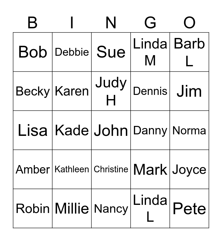 This bingo card has 37 words: Carol, Shirley, Diana, Karen, Joyce, Kathleen, Judy H, Barb Y, Barb L, Darla, Kade, Linda M, John, Norma, Becky, Amber, Donna, Sue, Christine, Danny, Bob, Jim, Robin, Nancy, Bette, Linda L, Debbie, Rita, Gail, Jill, Beverly, Millie, Lisa, Pete, Mark, Dennis and Judy S.