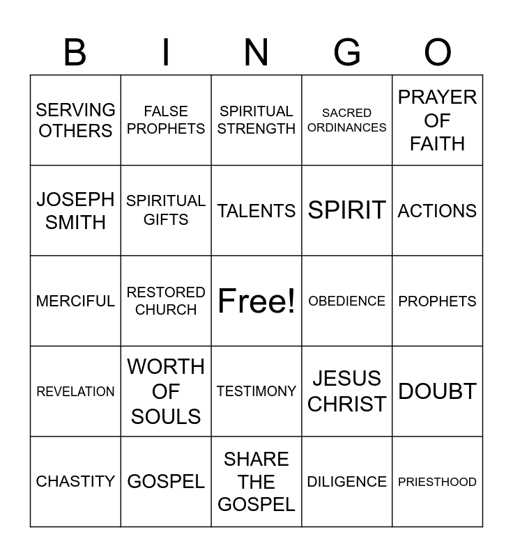 This bingo card has a free space and 39 words: MISSIONARY, FAITH, SIGNS, SPIRITUAL GIFTS, CHASTITY, TESTIMONY, TALENTS, STEWARDSHIP, PRAYER OF FAITH, REVELATION, RESTORED CHURCH, SACRED ORDINANCES, PRIESTHOOD, PROPHETS, OBEDIENCE, WORTH OF SOULS, REPENTANCE, SERVING OTHERS, SCRIPTURES, JESUS CHRIST, JOSEPH SMITH, SHARE THE GOSPEL, SPIRIT, ACTIONS, PONDER, BLESSINGS, VIRTUE, JUDGEMENT, TRUTH, FALSE PROPHETS, TREASURE, WEAKNESS, SPIRITUAL STRENGTH, GOSPEL, DILIGENCE, FEAR, DOUBT, MERCIFUL and CHARITY.