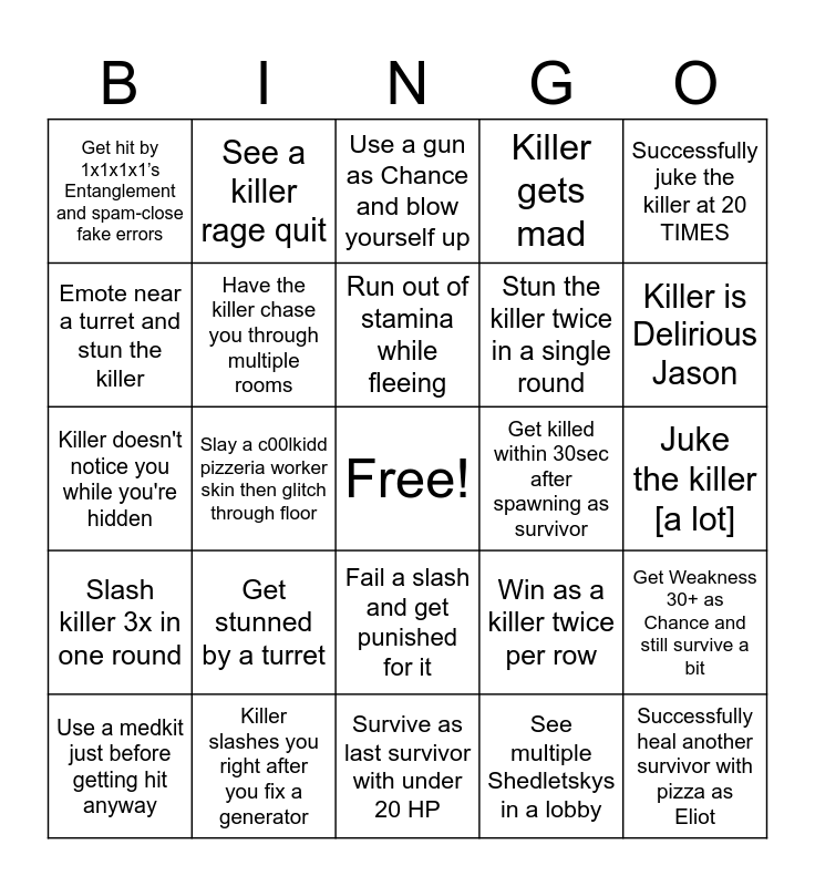 This bingo card has a free space and 24 words: Get stunned by a turret, Killer slashes you right after you fix a generator, Run out of stamina while fleeing, Use a medkit just before getting hit anyway, Successfully juke the killer at 20 TIMES, Get hit by 1x1x1x1’s Entanglement and spam-close fake errors, Emote near a turret and stun the killer, See a killer rage quit, Get killed within 30sec after spawning as survivor, Fail a slash and get punished for it, Stun the killer twice in a single round, Killer doesn't notice you while you're hidden, Win as a killer twice per row, Get Weakness 30+ as Chance and still survive a bit, Have the killer chase you through multiple rooms, See multiple Shedletskys in a lobby, Juke the killer [a lot], Use a gun as Chance and blow yourself up, Killer is Delirious Jason, Slay a c00lkidd pizzeria worker skin then glitch through floor, Successfully heal another survivor with pizza as Eliot, Slash killer 3x in one round, Killer gets mad and Survive as last survivor with under 20 HP.