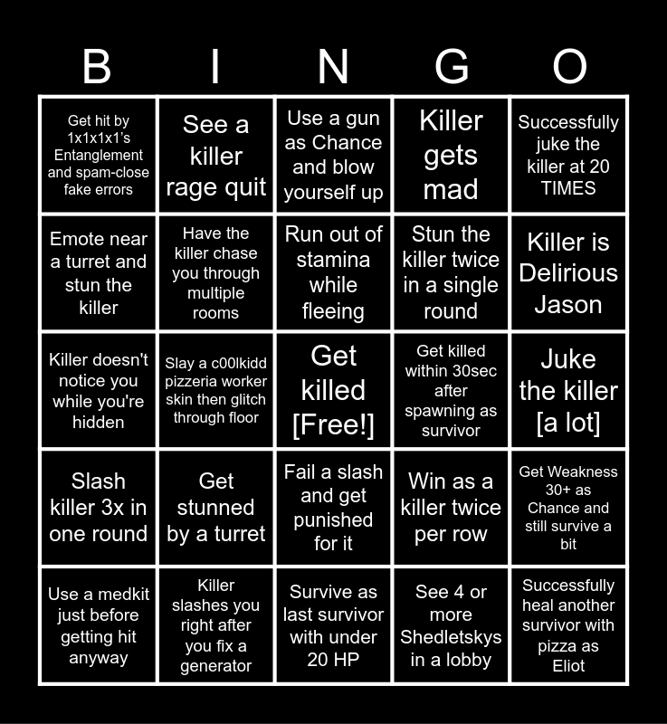 This bingo card has a free space and 24 words: Get stunned by a turret, Killer slashes you right after you fix a generator, Run out of stamina while fleeing, Use a medkit just before getting hit anyway, Successfully juke the killer at 20 TIMES, Get hit by 1x1x1x1’s Entanglement and spam-close fake errors, Emote near a turret and stun the killer, See a killer rage quit, Get killed within 30sec after spawning as survivor, Fail a slash and get punished for it, Stun the killer twice in a single round, Killer doesn't notice you while you're hidden, Win as a killer twice per row, Get Weakness 30+ as Chance and still survive a bit, Have the killer chase you through multiple rooms, See 4 or more Shedletskys in a lobby, Juke the killer [a lot], Use a gun as Chance and blow yourself up, Killer is Delirious Jason, Slay a c00lkidd pizzeria worker skin then glitch through floor, Successfully heal another survivor with pizza as Eliot, Slash killer 3x in one round, Killer gets mad and Survive as last survivor with under 20 HP.