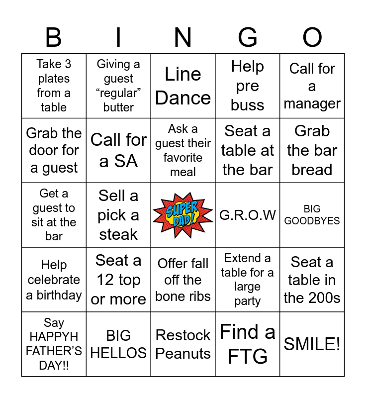 This bingo card has a free space and 24 words: Seat a 12 top or more, BIG HELLOS, Ask a guest their favorite meal, Say HAPPYH FATHER’S DAY!!, Call for a manager, Take 3 plates from a table, Grab the door for a guest, Giving a guest “regular” butter, G.R.O.W, Offer fall off the bone ribs, Seat a table at the bar, Get a guest to sit at the bar, Extend a table for a large party, Seat a table in the 200s, Call for a SA, Find a FTG, BIG GOODBYES, Line Dance, Grab the bar bread, Sell a pick a steak, SMILE!, Help celebrate a birthday, Help pre buss and Restock Peanuts.