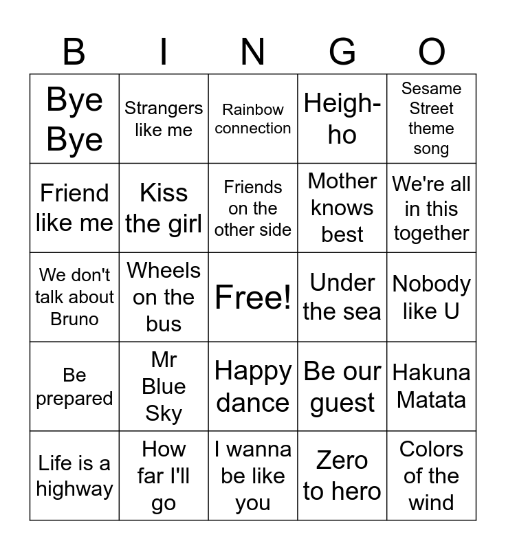 This bingo card has a free space and 35 words: I just can't wait to be king, I'll make a man out of you, You've got a friend in me, Kiss the girl, Happy dance, Heigh-ho, Friend like me, "C" is for cookie, Friends on the other side, Circle of life, We don't talk about Bruno, Sesame Street theme song, You're welcome, Do you want to build a smowman, Bye Bye, Under the sea, Zero to hero, Wheels on the bus, Be prepared, Colors of the wind, Be our guest, Life is a highway, Hakuna Matata, How far I'll go, Rainbow connection, We're all in this together, You'll be in my heart, Itsy bitsy spider, Mother knows best, Nobody like U, Hawaiian roller coaster ride, I wanna be like you, Mr Blue Sky, Strangers like me and All the stars.