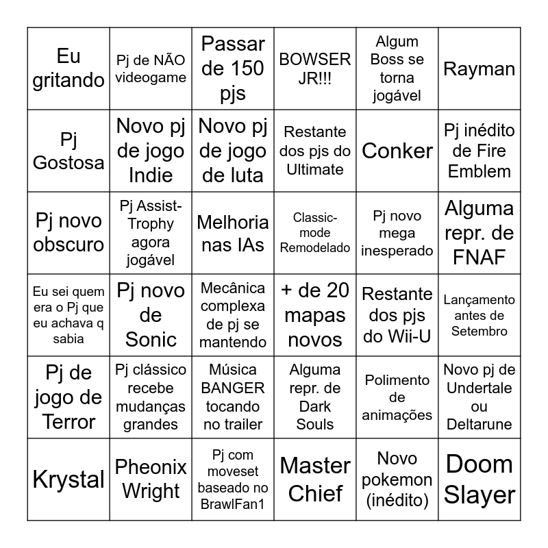 This bingo card has 37 words: Polimento de animações, Alguma repr. de Dark Souls, Novo pokemon (inédito), Pj Gostosa, Pj novo de Sonic, Pj novo mega inesperado, Novo pj de jogo Indie, Master Chief, Algum Boss se torna jogável, Krystal, Pj inédito de Fire Emblem, BOWSER JR!!!, Pj novo obscuro, Melhoria nas IAs, Rayman, Classic-mode Remodelado, Pj clássico recebe mudanças grandes, Passar de 150 pjs, Alguma repr. de FNAF, Pj Assist-Trophy agora jogável, Eu gritando, Restante dos pjs do Ultimate, Mecânica complexa de pj se mantendo, Restante dos pjs do Wii-U, Pheonix Wright, Lançamento antes de Setembro, Pj de NÃO videogame, Pj com moveset baseado no BrawlFan1, Novo pj de Undertale ou Deltarune, Música BANGER tocando no trailer, Pj da época do NES, + de 20 mapas novos, Conker, Pj de jogo de Terror, Eu sei quem era o Pj que eu achava q sabia, Novo pj de jogo de luta and Doom Slayer.