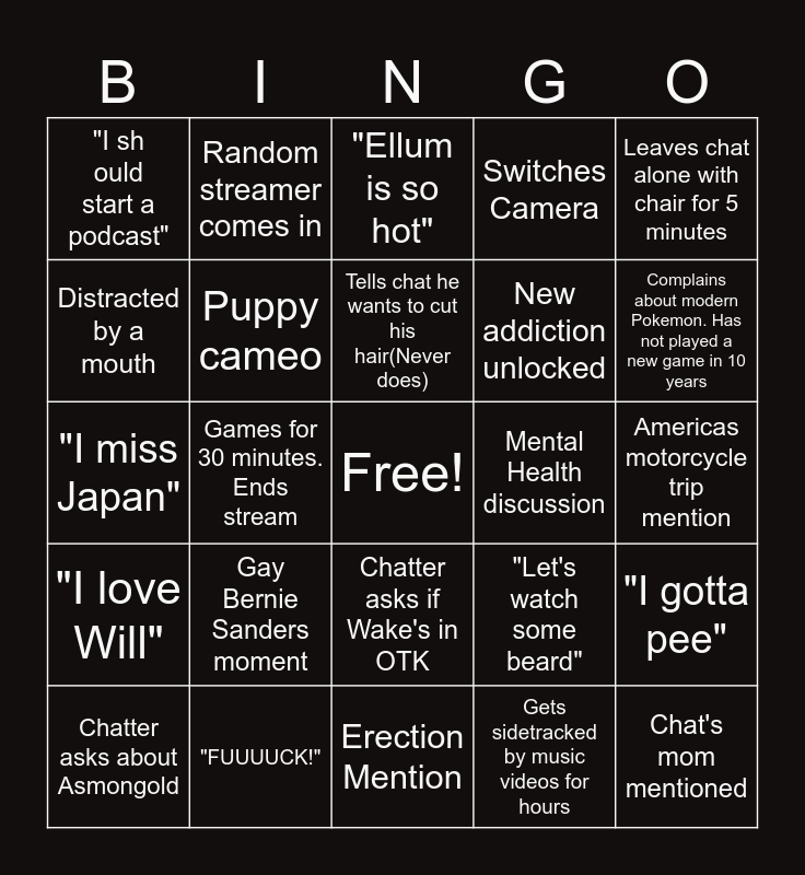 This bingo card has a free space and 32 words: Gets sidetracked by music videos for hours, Watches Food content until bedtime, Games for 30 minutes. Ends stream, "Should we watch some Gordo boys?"(Doesn't), "I love Will", Puppy cameo, Leaves chat alone with chair for 5 minutes, "I gotta pee", Random streamer comes in, Chatters asks about working out, Tells chat he wants to cut his hair(Never does), "Ellum is so hot", Shows pictures from high school, Past Trauma Reveal, Mental Health discussion, Chatter asks about Hasan, Chatter asks about Asmongold, "I miss Japan", Chatter asks if Wake's in OTK, Gay Bernie Sanders moment, "Let's watch some beard", Gets One guy-ed by chat, Americas motorcycle trip mention, "FUUUUCK!", Chat's mom mentioned, Switches Camera, New addiction unlocked, Distracted by a mouth, "I should start a podcast", Erection Mention, 148 Moment and Complains about modern Pokemon. Has not played a new game in 10 years.