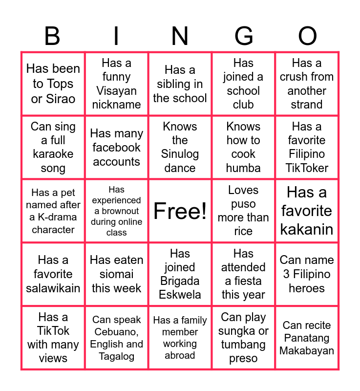 This bingo card has a free space and 24 words: Has eaten siomai this week, Can speak Cebuano, English and Tagalog, Knows the Sinulog dance, Has a TikTok with many views, Has a crush from another strand, Has been to Tops or Sirao, Can sing a full karaoke song, Has a funny Visayan nickname, Loves puso more than rice, Has joined Brigada Eskwela, Knows how to cook humba, Has a pet named after a K-drama character, Has attended a fiesta this year, Can name 3 Filipino heroes, Has many facebook accounts, Can play sungka or tumbang preso, Has a favorite kakanin, Has a sibling in the school, Has a favorite Filipino TikToker, Has experienced a brownout during online class, Can recite Panatang Makabayan, Has a favorite salawikain, Has joined a school club and Has a family member working abroad.