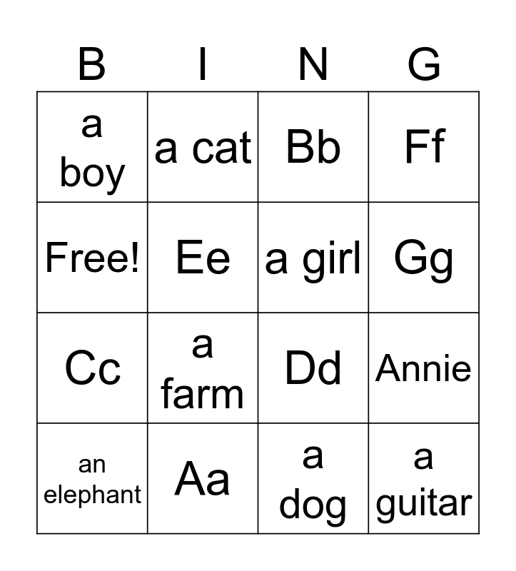 This bingo card has 16 words: Aa, Annie, Bb, a boy, Cc, a cat, Dd, a dog, Free!, Ee, an elephant, Ff, a farm, Gg, a girl and a guitar.