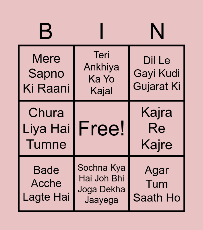 This bingo card has a free space and 50 words: Ankhon Mein Kajal Hai, Yeh Naina Yeh Kajal, Mera Kajal, Kajal Kajal, Kajra Mohobbat Wala, Kajra Lagake Gajra Sajake, Teri Ankhiya Ka Yo Kajal, Na Kajre Ki Dhaar, Kajra Re Kajre, Yeh Ladki Pagal Hai, Bade Acche Lagte Hai, Chura Liya Hai Tumne, Humko Mili Hai Aaj Yeh (Lag Jaa Gale), Tumse Milke Aisa Laga, Mile Ho Tum Humko, Tera Mujhse Hai Pehle Ka Naata Koi, Sochna Kya Hai Joh Bhi Joga Dekha Jaayega, Jab Koi Baat Bigad Jaaye, Tera Saath Hai Toh, Agar Tum Saath Ho, Ek Din Aap Yaun Humko, Le Gayi Le Gayi Dil Le Gayi, Mere Sapno Ki Raani, Kya Khoob Lagti Ho, Bekaraar Karke Hume Yaun Na Jaaiye, Nakhre Wali, Jeena Yahah Marna Yahan, Lipstick Song, Dil Le Gayi Kudi Gujarat Ki, Ek Ladki Bheegi Bhaagi Si, Ek Ladki Ko Dekh Toh, Khudko Kya Samjhti Hai Kitna Akadti Hai, Gazab Ka Hai Din, Tum Mile Dil Khile, Yeh Haseen Wadiya Yeh Khula Aasmaan, Gulabi Ankhein, Aaj Kal Tere Mere Pyaar Ke, Tere Jaisa Yaar Kahan, Yeh Dosti, Kisi Ke Haath Mein Heera, Dance Pe Chance, Humma Humma, Pyaar Deewana Hota Hai, Yeh Sama, Dil Ko Hazaar Baar, Mera Naam Chin Chin Chuu, Babuji Zara Dheera Chalo, Baby Ko Base Pasand Hai, Kar Gayi Chull and Chitiyaan Kalaiyaan Ve.