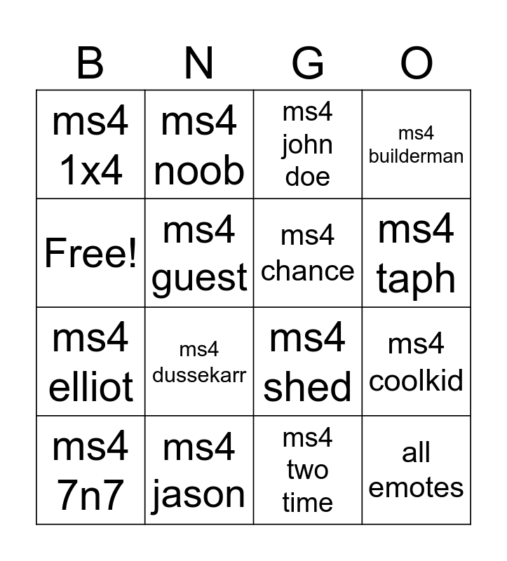 This bingo card has 16 words: ms4 jason, ms4 coolkid, ms4 john doe, ms4 1x4, ms4 elliot, ms4 noob, ms4 shed, ms4 two time, Free!, ms4 guest, ms4 7n7, ms4 builderman, ms4 dussekarr, ms4 taph, ms4 chance and all emotes.