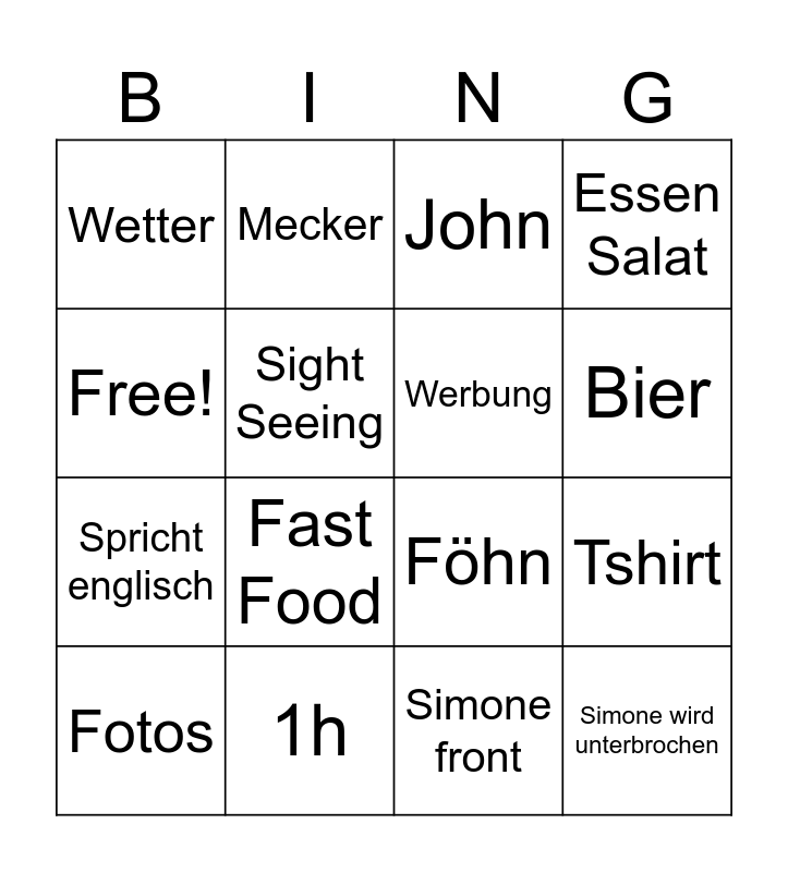 This bingo card has 16 words: 1h, Tshirt, John, Wetter, Spricht englisch, Mecker, Föhn, Simone front, Free!, Sight Seeing, Fotos, Essen Salat, Fast Food, Bier, Werbung and Simone wird unterbrochen.