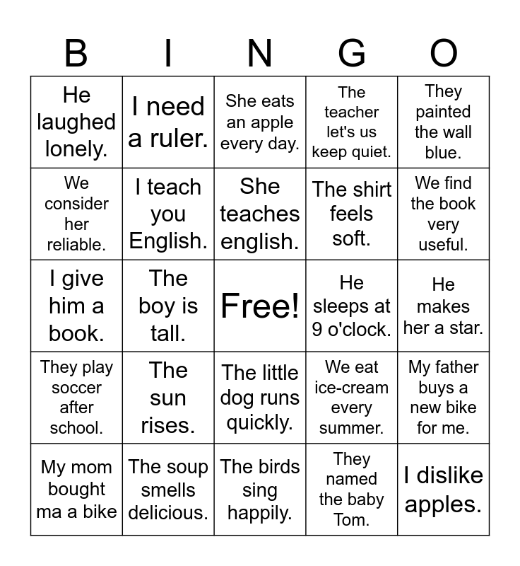 This bingo card has a free space and 24 words: The sun rises., The soup smells delicious., She teaches english., My mom bought ma a bike, They painted the wall blue., He laughed lonely., We consider her reliable., I need a ruler., He sleeps at 9 o'clock., The little dog runs quickly., The shirt feels soft., I give him a book., We eat ice-cream every summer., My father buys a new bike for me., I teach you English., They named the baby Tom., He makes her a star., She eats an apple every day., We find the book very useful., The boy is tall., I dislike apples., They play soccer after school., The teacher let's us keep quiet. and The birds sing happily..