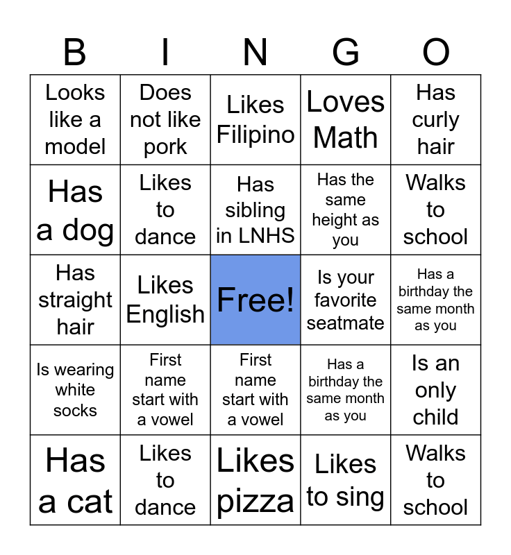 This bingo card has a free space and 49 words: Likes color blue, Walks to school, Has a cat, Likes pizza, First name start with a vowel, Is wearing black socks, Does not like pork, Has a sister, Has a dog, Has a younger brother, Likes to dance, Loves Math, Is an only child, Has a birthday the same month as you, Has a curly hair, Is very kind to you, Has sibling in LNHS, Is your favorite seatmate, Is your best friend, Has curly hair, Likes English, Likes to sing, Looks like a model, Has the same height as you, Likes color red, Walks to school, Has a cat, Likes carrots, First name start with a vowel, Is wearing white socks, Does not like pork, Has a sister, Has a dog, Has a younger brother, Likes to dance, Loves Science, FREE SPACE, Is an only child, Has a birthday the same month as you, Has a curly hair, Is very kind to you, Has sibling in LNHS, Is your favorite seatmate, Is your best friend, Has straight hair, Likes Filipino, Likes to sing, Wants to become a teacher and Has the same height as you.