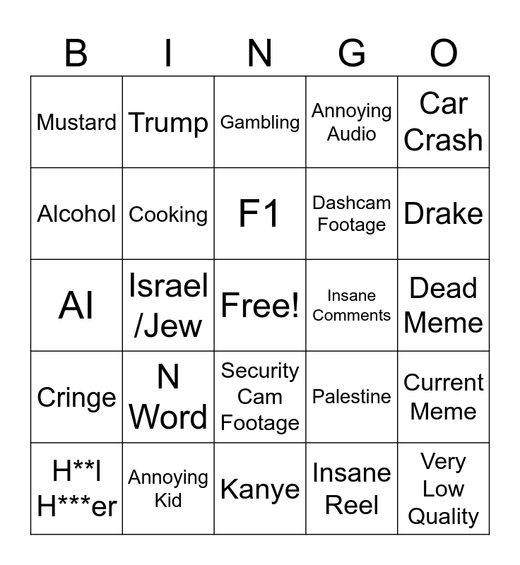 This bingo card has a free space and 24 words: N Word, Annoying Kid, F1, H**l H***er, Car Crash, Mustard, Alcohol, Trump, Insane Comments, Security Cam Footage, Dashcam Footage, AI, Palestine, Current Meme, Cooking, Insane Reel, Dead Meme, Gambling, Drake, Israel /Jew, Very Low Quality, Cringe, Annoying Audio and Kanye.