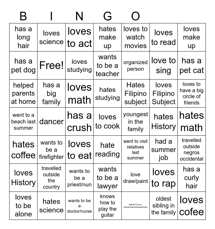 This bingo card has a free space and 48 words: love draw/paint, love to sing, knows how to play the guitar, dancer, loves math, hates math, loves science, hates science, loves to read, hate reading, loves make up, hates make up, loves Filipino Subject, Hates Filipino subject, loves History, hates History, has a pet dog, has a pet cat, loves to rap, loves to watch movies, organized person, has a crush, has a long hair, Free!, has a curly hair, loves studying, loves to have a big circle of friends, loves to be alone, hates studying, has a big family, oldest sibling in the family, youngest in the family, travelled outside negros occidental, travelled outside the country, went to a beach last summer, went to visit relatives last summer, had a summer job, helped parents at home, loves to eat, wants to be a priest/nun, hates coffee, loves cofee, loves to act, wants to be a doctor/nurse, wants to be a teacher, wants to be a lawyer, wants to be a firefighter and wants to be a policeman/policewoman.