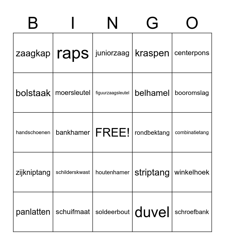 This bingo card has a free space and 69 words: plintentrapje, combinatietang, maatrol, stokduim, schuifmaat, meetlat, kraspen, steekpasser, centerpons, priem, winkelhoek, handzaag, zaagkap, juniorzaag, figuurzaag, bankhamer, houtenhamer, belhamel, nijptang, zijkniptang, rondbektang, striptang, booromslag, handboor, elektr. handboormachine, elektr. tafelboormachine, accu boormachine, kitpistool, duvel, spiraalboor, raps, verzinkboor, stanley mes, pedicuresetje, buigveer, zetbank, schuurpapier, blokschaaf, bolstaak, verwarmingsbalk, schilderskwast, schroefbank, klemboor, lijmklem, plaatklem, panlatten, figuurzaagklem, waterpomptang, blindklinktang, moersleutel, figuurzaagsleutel, steeksleutel, imbussleutel, soldeerbout, montagekit, kruiskopschr.draaier, platkopschr. draaier, waterpas, veiligheidsbril, handschoenen, spijker, schroef, cirkelzaag, stofkapje, plintentrapje, ijzerzaag, belhamel, hefboomschaar and verfroller.