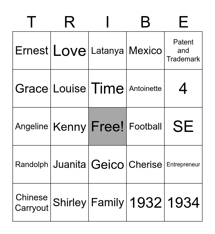 This bingo card has a free space and 24 words: Juanita, Shirley, Time, Chinese Carryout, Patent and Trademark, Ernest, Grace, Love, Football, Geico, Antoinette, Angeline, Cherise, Entrepreneur, Louise, 1932, SE, Latanya, 4, Kenny, 1934, Randolph, Mexico and Family.