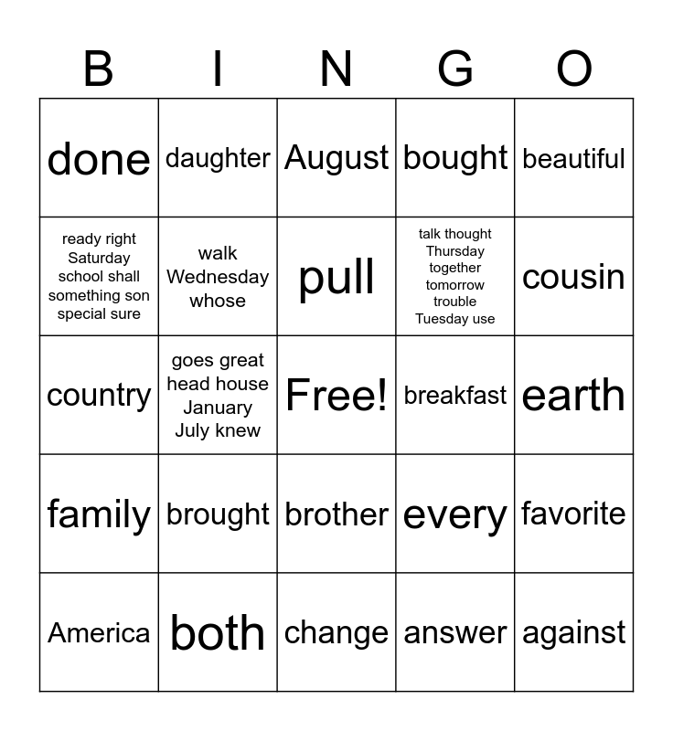This bingo card has a free space and 44 words: again, against, always, America, animal, answer, August, away, beautiful, both, bought, breakfast, brother, brought, carry, change, city, country, couple, cousin, daughter, December, different, done, early, earth, eight, enough, every, family, father, favorite, February, full, goes great head house January July knew, know large laugh learn, lose Monday mother move night ocean often once, only picture piece place please pretty, pull, ready right Saturday school shall something son special sure, talk thought Thursday together tomorrow trouble Tuesday use, used, walk Wednesday whose and won.