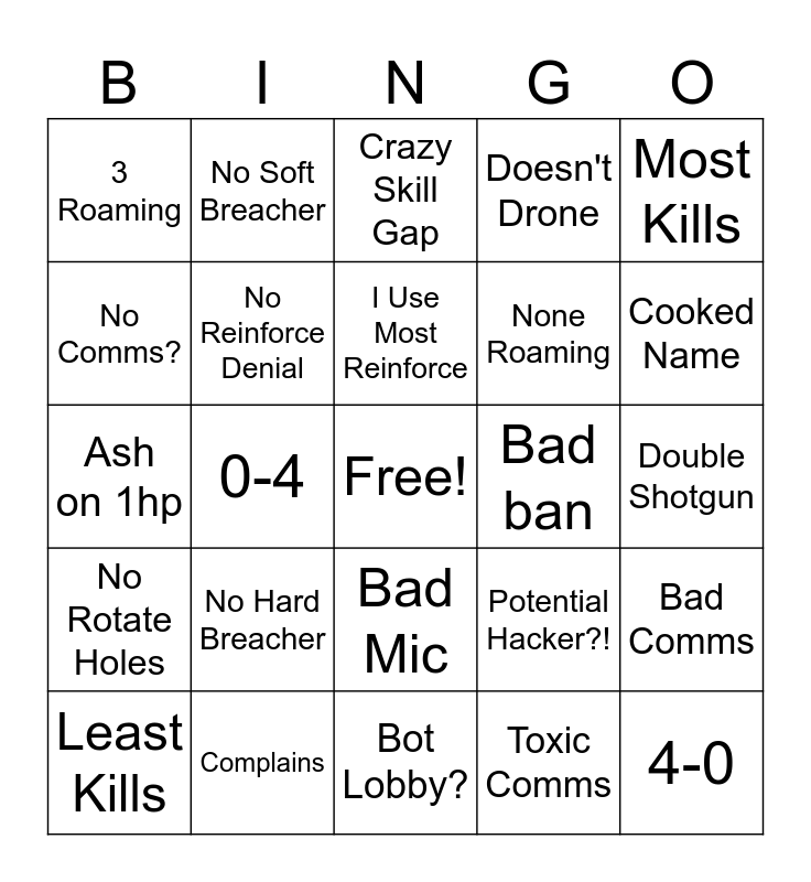 This bingo card has a free space and 24 words: No Hard Breacher, Complains, I Use Most Reinforce, Least Kills, Most Kills, 3 Roaming, No Comms?, No Soft Breacher, Bad ban, Bad Mic, None Roaming, Ash on 1hp, Potential Hacker?!, Bad Comms, No Reinforce Denial, Toxic Comms, Double Shotgun, Crazy Skill Gap, Cooked Name, 0-4, 4-0, No Rotate Holes, Doesn't Drone and Bot Lobby?.