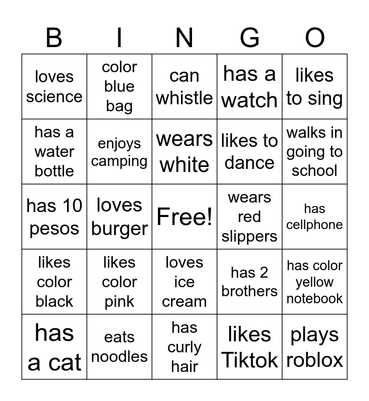 This bingo card has a free space and 24 words: likes color pink, eats noodles, wears white, has a cat, likes to sing, loves science, has a water bottle, color blue bag, wears red slippers, loves ice cream, likes to dance, has 10 pesos, has 2 brothers, has color yellow notebook, enjoys camping, likes Tiktok, has cellphone, can whistle, walks in going to school, loves burger, plays roblox, likes color black, has a watch and has curly hair.