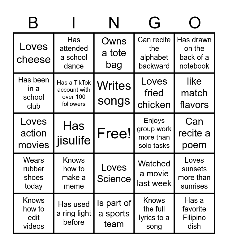 This bingo card has a free space and 56 words: Has never been late to school, Knows how to edit videos, Brings their own utensils, Loves cheese, Is part of a sports team, Loves singing in the shower, Has a TikTok account with over 100 followers, Knows how to whistle, Loves fried chicken, Is wearing something blue today, Can recite the alphabet backward, Can name 5 countries, Has an inspirational wallpaper on their phone, Can list 3 school rules, Is left-handed, Loves spicy food, Has drawn on the back of a notebook, Has jisulife, Wants to work abroad, Has a favorite Filipino dish, Enjoys group work more than solo tasks, Has watched a local teleserye, Watched a movie last week, Owns a tote bag, only child, Writes songs, Knows how to ride a bike, has a pink lipstick, like match flavors, Prefers chocolate over vanilla, Has been class president before, Knows how to swim, Has tried vlogging, Wants to become a teacher, Can recite a poem, Has been in a school club, Loves action movies, Was born outside this city/town, Wears rubber shoes today, Has attended a school dance, Loves Science, Has helped cook at home this week, Favorite color is black, Can do a hand trick (like finger snapping), Brings a tumbler or water bottle, Knows how to make a meme, Has used a ring light before, Can imitate a celebrity voice, Writes stories or poems, Likes watching horror movies, Knows the full lyrics to a song, Has already completed an assignment, Knows their zodiac sign, Has tried learning a TikTok dance but failed, Loves sunsets more than sunrises and Enjoys group work more than solo tasks.