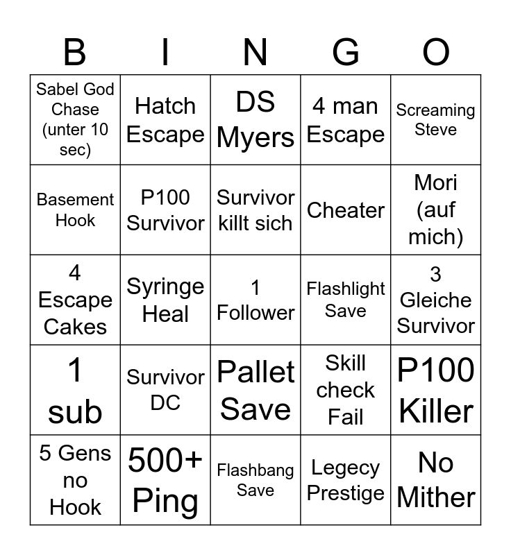 This bingo card has a free space and 24 words: Survivor DC, 500+ Ping, Survivor killt sich, 5 Gens no Hook, Screaming Steve, Sabel God Chase (unter 10 sec), Basement Hook, Hatch Escape, Flashlight Save, Pallet Save, Cheater, 4 Escape Cakes, Skill check Fail, P100 Killer, P100 Survivor, Legecy Prestige, 3 Gleiche Survivor, DS Myers, Mori (auf mich), Syringe Heal, No Mither, 1 sub, 4 man Escape and Flashbang Save.