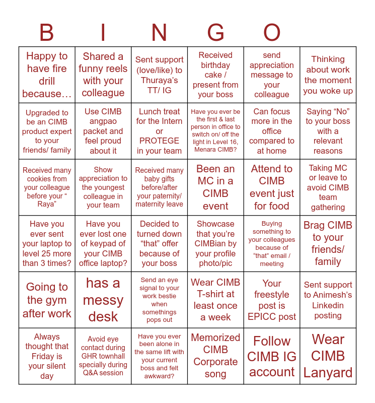 This bingo card has 36 words: Have you ever sent your laptop to level 25 more than 3 times?, Have you ever lost one of keypad of your CIMB office laptop?, Have you ever been alone in the same lift with your current boss and felt awkward?, Have you ever be the first & last person in office to switch on/ off the light in Level 16, Menara CIMB?, Attend to CIMB event just for food, Taking MC or leave to avoid CIMB team gathering, Happy to have fire drill because…, Avoid eye contact during GHR townhall specially during Q&A session, Sent support (love/like) to Thuraya’s TT/ IG, Wear CIMB T-shirt at least once a week, Can focus more in the office compared to at home, Thinking about work the moment you woke up, Going to the gym after work, Show appreciation to the youngest colleague in your team, Lunch treat for the Intern or PROTEGE in your team, Received birthday cake / present from your boss, Your freestyle post is EPICC post, Brag CIMB to your friends/ family, Upgraded to be an CIMB product expert to your friends/ family, Use CIMB angpao packet and feel proud about it, Decided to turned down “that” offer because of your boss, Showcase that you’re CIMBian by your profile photo/pic, Buying something to your colleagues because of “that” email / meeting, Sent support to Animesh’s Linkedin posting, Received many cookies from your colleague before your “ Raya”, Shared a funny reels with your colleague, Received many baby gifts before/after your paternity/ maternity leave, Memorized CIMB Corporate song, send appreciation message to your colleague, Saying “No” to your boss with a relevant reasons, Always thought that Friday is your silent day, has a messy desk, Send an eye signal to your work bestie when somethings pops out, Been an MC in a CIMB event, Follow CIMB IG account and Wear CIMB Lanyard.