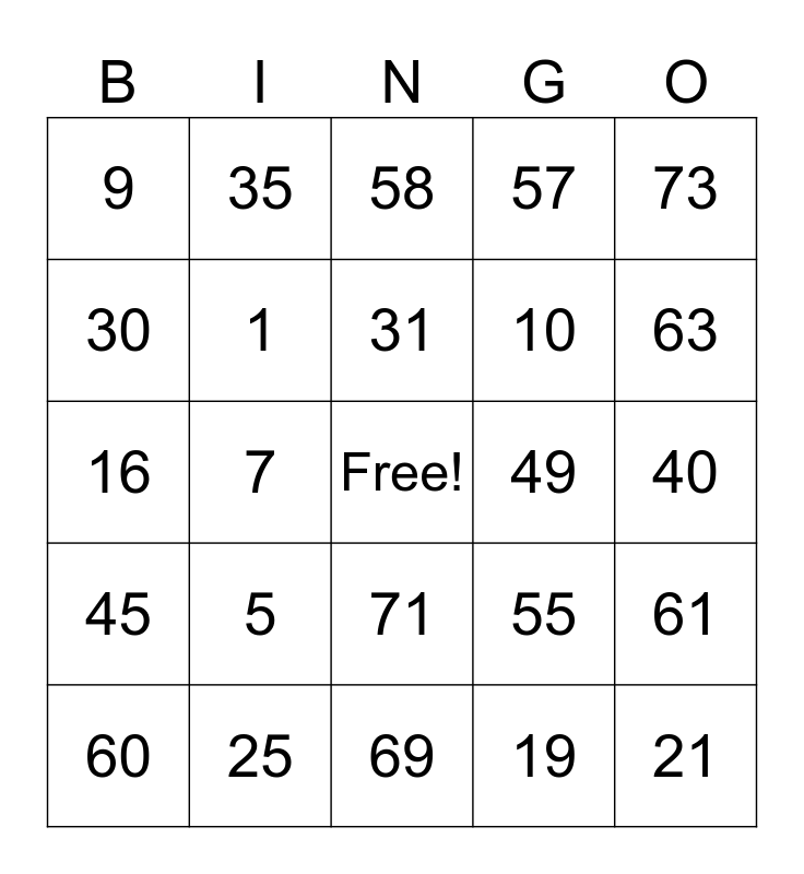 This bingo card has a free space and 24 words: 5, 25, 31, 60, 73, 9, 30, 35, 49, 71, 10, 16, 55, 61, 1, 19, 40, 58, 63, 7, 21, 45, 57 and 69.