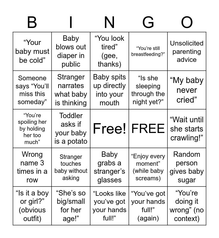 This bingo card has a free space and 25 words: Stranger touches baby without asking, “Looks like you’ve got your hands full!”, Baby spits up directly into your mouth, “Is it a boy or girl?” (obvious outfit), Unsolicited parenting advice, “Your baby must be cold”, Someone says “You’ll miss this someday”, Baby blows out diaper in public, FREE, Baby grabs a stranger’s glasses, “Is she sleeping through the night yet?”, “You’re spoiling her by holding her too much”, “Enjoy every moment” (while baby screams), Random person gives baby sugar, Stranger narrates what baby is thinking, “You’ll understand when you’re older”, “Wait until she starts crawling!”, “You look tired” (gee, thanks), “My baby never cried”, Toddler asks if your baby is a potato, “You’re doing it wrong” (no context), “She’s so big/small for her age!”, Wrong name 3 times in a row, “You’re still breastfeeding?” and “You’ve got your hands full!” (again).