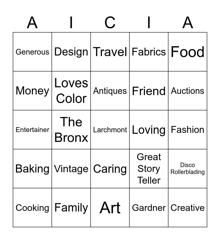 This bingo card has 25 words: Vintage, Art, Antiques, Cooking, Food, Generous, Money, Design, Loving, Caring, Friend, Entertainer, Great Story Teller, Disco Rollerblading, Loves Color, Creative, Fashion, Travel, Auctions, The Bronx, Larchmont, Family, Baking, Fabrics and Gardner.