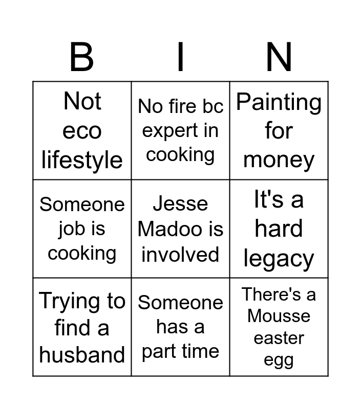 This bingo card has a free space and 8 words: It's a hard legacy, Painting for money, No fire bc expert in cooking, Trying to find a husband, Not eco lifestyle, There's a Mousse easter egg, Someone job is cooking and Someone has a part time.